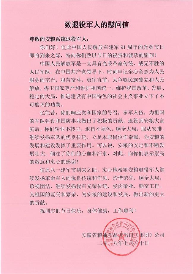 中國人民解放軍建軍91周年節(jié)日前夕,根據(jù)集團(tuán)黨委的部署,集團(tuán)工會(huì)慰問了安糧系統(tǒng)全體退役軍人,向他們送上節(jié)日的問候和美好的祝愿!