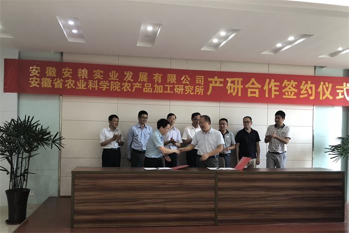 2018年9月19日,安徽省農(nóng)業(yè)科學院副院長畢小彬、農(nóng)產(chǎn)品加工研究所所長錢坤等一行六人在安糧集團黨委委員、監(jiān)事會主席曹訓立,安糧實業(yè)董事長吳國杰的陪同下,來到安糧(巢湖)食品工業(yè)園進行調研考察并簽訂了產(chǎn)研合作戰(zhàn)略協(xié)議。