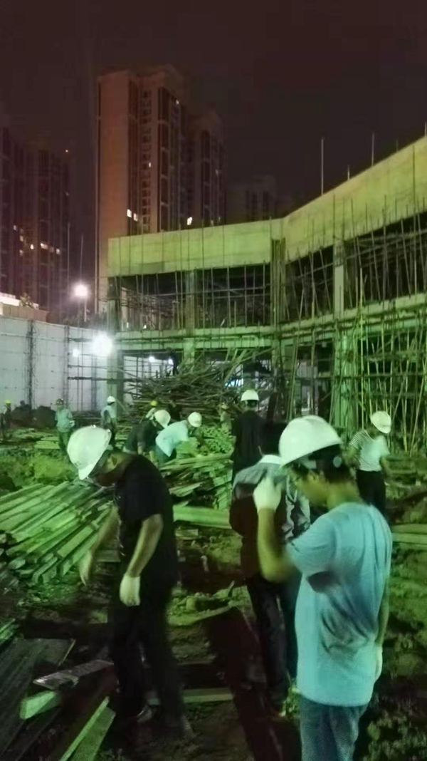 經(jīng)過(guò)簡(jiǎn)短的會(huì)議部署,項(xiàng)目部管理人員即刻動(dòng)員組織農(nóng)民工加班,楊勇親自和工人們面對(duì)面溝通,對(duì)工人們曉之以理動(dòng)之以情。不到11點(diǎn)半,工地現(xiàn)場(chǎng)的工作燈通通亮了起來(lái),鋼筋班組、木工班組、管理人員紛紛投入工作,形成了一組初秋深夜的奏鳴曲。所有管理人員也都在現(xiàn)場(chǎng)陪著工人們一起干,不完成任務(wù)誰(shuí)都不休息。