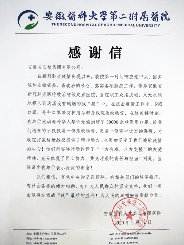 捐贈(zèng)儀式上,安醫(yī)大二附院黨委副書(shū)記高長(zhǎng)林親自將感謝信交到安糧實(shí)業(yè)黨支部書(shū)記、董事長(zhǎng)吳國(guó)杰手中,正如安醫(yī)大二附院的感謝信中所寫(xiě)“這不僅僅是一份急缺物資,更是一份雪中送炭的溫暖”,作為安徽省內(nèi)大型的專(zhuān)業(yè)進(jìn)出口貿(mào)易企業(yè),安糧實(shí)業(yè)為疫情防控做力所能及的事情是榮幸,更是一種責(zé)任,相信眾志成城,共克時(shí)艱,這場(chǎng)疫情阻擊戰(zhàn)就一定能夠打贏!