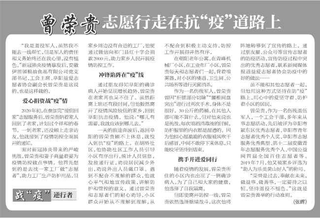 黃山人曾榮貴是安徽伊思頓糧油食品有限公司黨支部書記,他是一名傷殘退伍軍人,擔(dān)任阜陽(yáng)益愛志愿者協(xié)會(huì)副會(huì)長(zhǎng),曾積極參與過大小百余次公益活動(dòng),被評(píng)選為“助人為樂黃山好人”稱號(hào)。在今年新冠病毒蔓延的特殊時(shí)期,曾榮貴不僅捐資戰(zhàn)“疫”,更沖鋒在前。正月初一,他就協(xié)同當(dāng)?shù)卮鍍晌e極投入到防控疫情一線,白天走進(jìn)村委會(huì)和公共場(chǎng)所開展防疫消毒,幫助村兩委工作人員開展出入人員管控;晚上編輯公眾號(hào)文章,宣傳防疫活動(dòng)和防疫過程中的好做法,用行動(dòng)踐行了共產(chǎn)黨員的初心使命,發(fā)揮了黨員的先鋒模范作用。