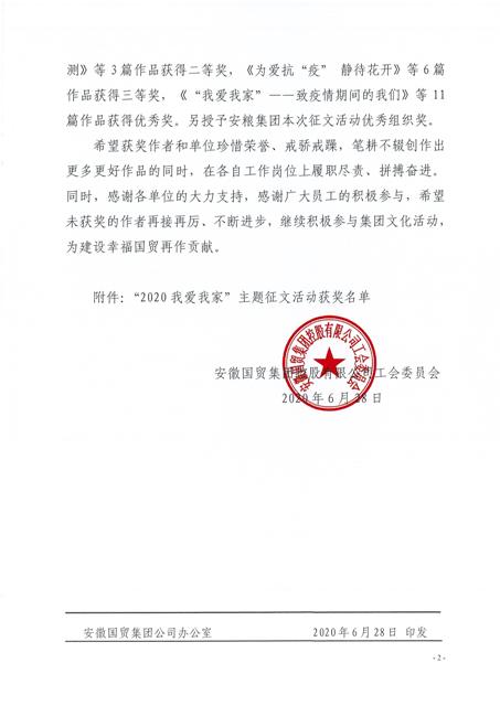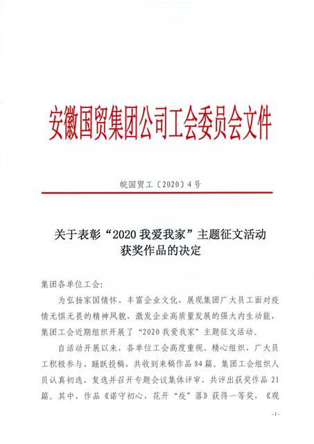 為弘揚(yáng)家國(guó)情懷、豐富企業(yè)文化,國(guó)貿(mào)集團(tuán)工會(huì)組織開展了“2020我愛我家”主題征文活動(dòng)。安糧集團(tuán)工會(huì)積極參與,最終斬獲多項(xiàng)獎(jiǎng)項(xiàng),以最佳的姿態(tài)畫上圓滿的句號(hào)。