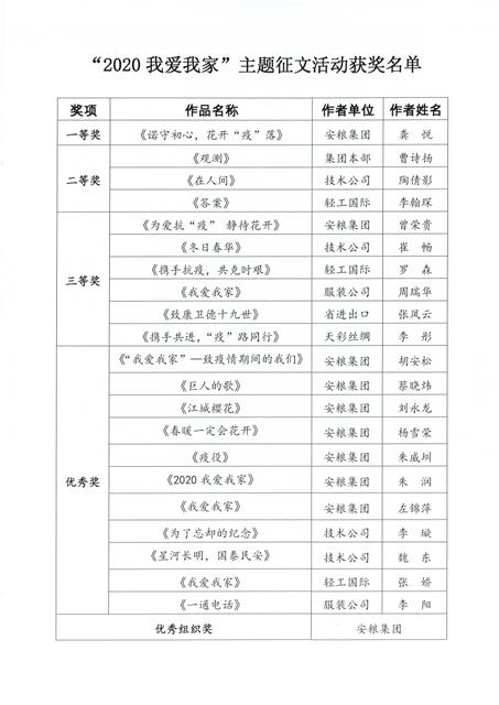 安糧集團(tuán)工會(huì)自接到通知后,組織各分工會(huì)、工會(huì)小組積極動(dòng)員員工,踴躍投稿,共征得稿件42篇,占國(guó)貿(mào)集團(tuán)總投稿數(shù)84篇的一半。最終,安糧期貨龔悅的《諾守初心,花開“疫”落》和安糧實(shí)業(yè)曾榮貴的《為愛抗“疫” 靜待花開》分別榮獲一等獎(jiǎng)和三等獎(jiǎng),安糧控股蔡曉煒的《巨人的歌》等7篇作品榮獲優(yōu)秀獎(jiǎng)。安糧集團(tuán)因高度重視、精心組織,特別榮獲優(yōu)秀組織獎(jiǎng)。