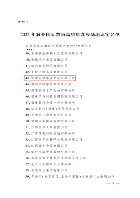 日前,農(nóng)業(yè)農(nóng)村部發(fā)布了《關(guān)于認(rèn)定2022年農(nóng)業(yè)國際貿(mào)易高質(zhì)量發(fā)展基地的通知》,經(jīng)省級推薦、專家評審、綜合評議和公示,認(rèn)定安徽安糧實(shí)業(yè)發(fā)展有限公司等116個(gè)基地為2022年農(nóng)業(yè)國際貿(mào)易高質(zhì)量發(fā)展基地。