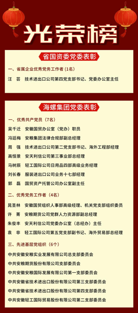 近日,省國資委黨委、海螺集團(tuán)黨委分別開展了省屬企業(yè)和集團(tuán)優(yōu)秀共產(chǎn)黨員、優(yōu)秀黨務(wù)工作者、先進(jìn)基層黨組織表彰,安徽國貿(mào)所屬技術(shù)進(jìn)出口公司汪蕓同志榮獲省屬企業(yè)優(yōu)秀黨務(wù)工作者稱號,吳千遷等7名同志榮獲集團(tuán)優(yōu)秀共產(chǎn)黨員稱號,晁圣林等4名同志榮獲集團(tuán)優(yōu)秀黨務(wù)工作者稱號,安糧實(shí)業(yè)公司黨總支等6個基層黨組織榮獲集團(tuán)先進(jìn)基層黨組織稱號。