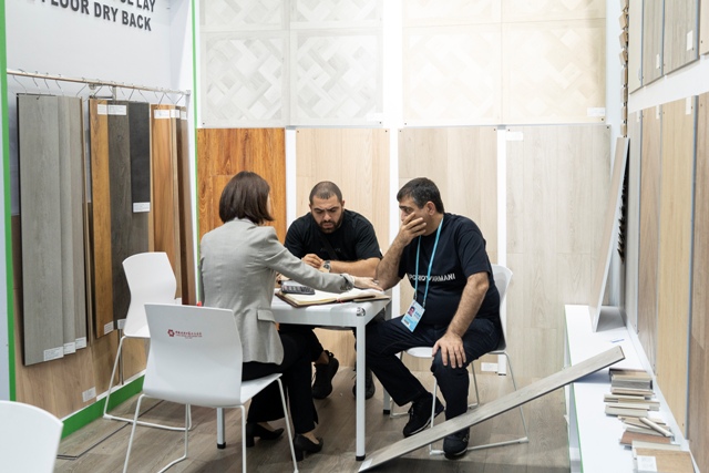 建材展位展品主要為室內(nèi)強(qiáng)化木地板、防水木地板、石塑SPC及WPC地板等。到訪客戶(hù)大多來(lái)自南美,也有部分中東、歐洲等國(guó)的新客戶(hù)。結(jié)合目標(biāo)市場(chǎng),業(yè)務(wù)部提前準(zhǔn)備了最新流行的木紋拼花地板等產(chǎn)品,其獨(dú)特的款式和顏色吸引了眾多新老客戶(hù)駐足洽談。