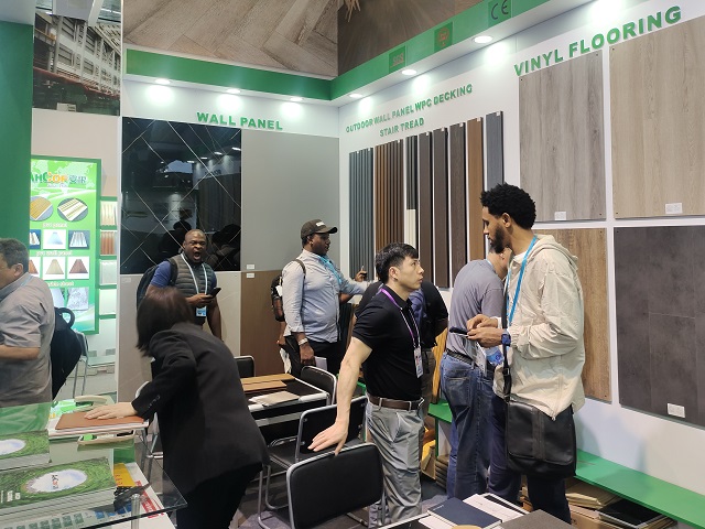 建材展位重點(diǎn)推出了墻板,格柵,樓梯踏板以及木塑戶外地板等新產(chǎn)品,從室內(nèi)到戶外產(chǎn)品一應(yīng)俱全。參展部門根據(jù)對(duì)去年秋季交易會(huì)的考察分析以及近期客戶最新詢盤情況的整合梳理,積極開拓更新參展產(chǎn)品。結(jié)合國(guó)外最新流行的趨勢(shì),推出了拼花木紋,石紋等當(dāng)下十分暢銷的花色。利用立體燈箱,將產(chǎn)品優(yōu)勢(shì),產(chǎn)品結(jié)構(gòu)剖面等信息直觀展示,讓客戶更加清晰地了解產(chǎn)品的性能和優(yōu)點(diǎn),吸引諸多專業(yè)買家的觀看和洽談。此外,在攤位新增產(chǎn)品拼裝的體驗(yàn)區(qū),增加產(chǎn)品小樣及配件的DIY拼裝,吸引客戶自己動(dòng)手,大大提升了參與度和體驗(yàn)感,讓客戶真切地感受到安糧的誠(chéng)意與新意。