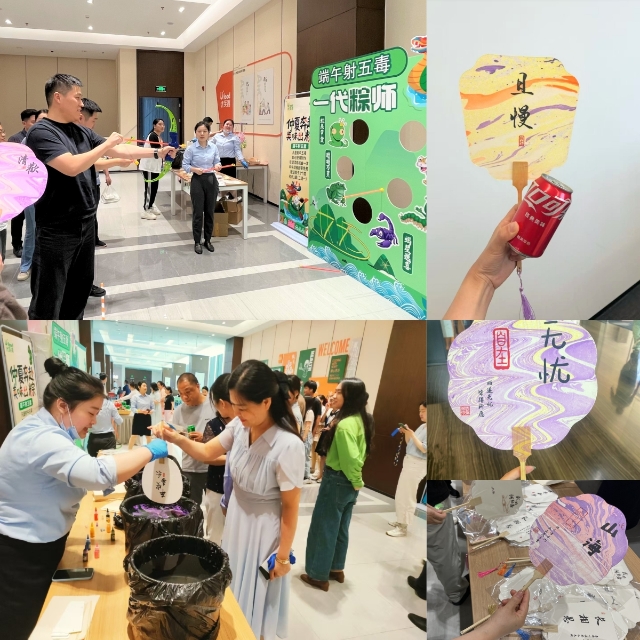 5月29日,在公司餐廳開(kāi)展的“仲夏奔赴?美味出粽”端午趣味活動(dòng),吸引了眾多員工熱情參與?;顒?dòng)現(xiàn)場(chǎng)最具人氣的“端午射五毒”游戲,參與者手持弓箭瞄準(zhǔn)背景板上的蛇、蝎等“五毒”圖案,在體驗(yàn)傳統(tǒng)民俗競(jìng)技樂(lè)趣的同時(shí),寄托驅(qū)邪避毒、祈福安康的心愿。同步開(kāi)展的非遺漆扇制作活動(dòng)讓員工通過(guò)親手創(chuàng)作進(jìn)一步深化對(duì)非遺文化的認(rèn)知。成品扇子上,“山?!薄盁o(wú)憂”“且慢”等字樣與端午元素、傳統(tǒng)書(shū)法相映成趣。