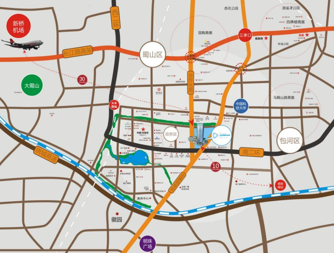 安糧國貿中心位于安徽省合肥市蜀山區(qū)金寨南路 811 號(金寨南路與南二環(huán)交口西北角),為政務、蜀山與包河三區(qū)交匯的黃金核心,南二環(huán)、金寨路及合作化路三大主干道交匯的稀缺區(qū)位。合肥市政府政務中心、奧體中心、合肥大劇院等構筑起集政務辦公、文化演藝、體育盛會、高端商務于一體的復合型價值生態(tài)圈,為項目注入源源不斷的消費動能與品質客群。